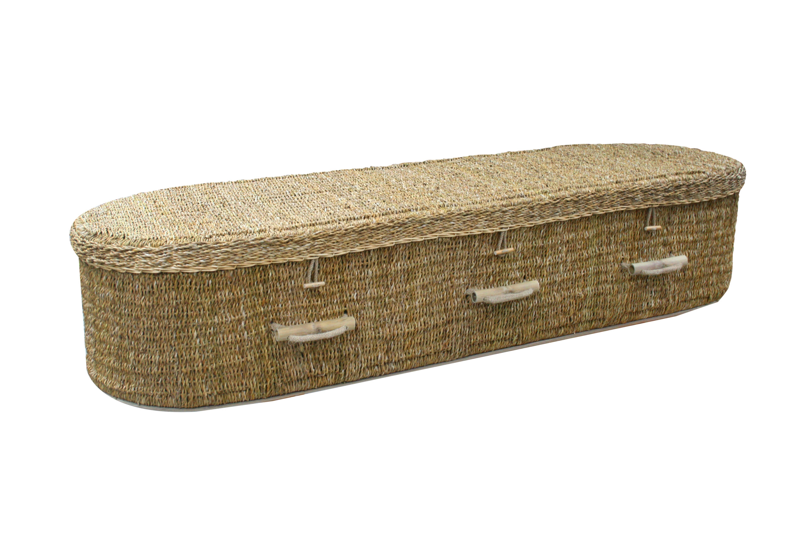Hand-woven Willow Coffin, with round ends, available in either a chestnut or a natural finish.