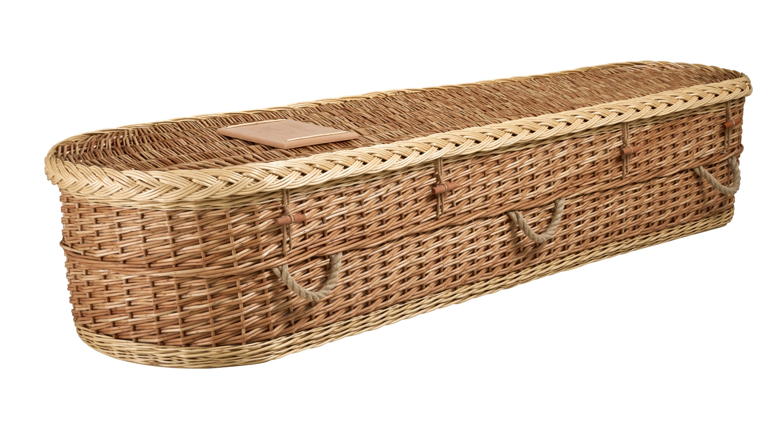 Hand-woven Willow Coffin, with round ends, available in either a chestnut or a natural finish.