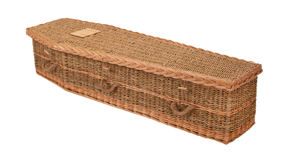 A beautiful natural woven coffin supplied with a soft natural fabric lining, ply name plate and rope handles.